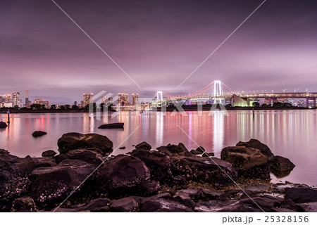 お台場の夜景 自由の女神像とレインボーブリッジ ピンクリボンフェスティバル期間特別ライトアップ