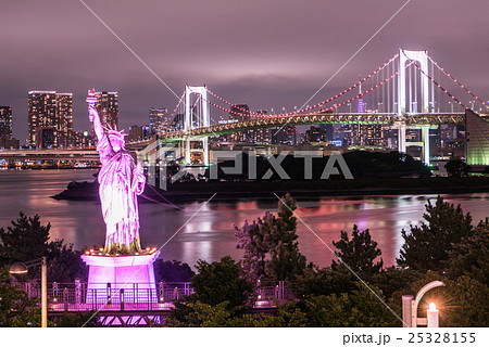お台場の夜景 自由の女神像とレインボーブリッジ ピンクリボンフェスティバル期間特別ライトアップ