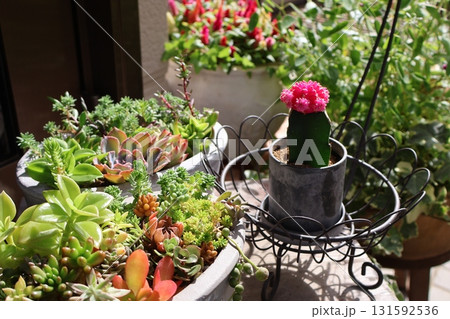 多肉の寄せ植えとピンクの緋牡丹