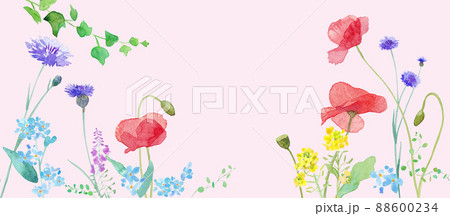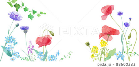 色々な花が咲き乱れる、春の野原の水彩イラスト。フレーム装飾。