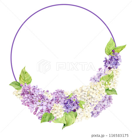 Elegant oval frame with lilac. Template with spring flowers with place for text. Card for Mother's Day, Valentine's Day. Illustration for wedding decoration in the rustic style of Provence.
