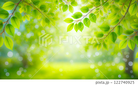 新緑の葉と光が織りなすナチュラル背景 – 爽やかなボケ効果