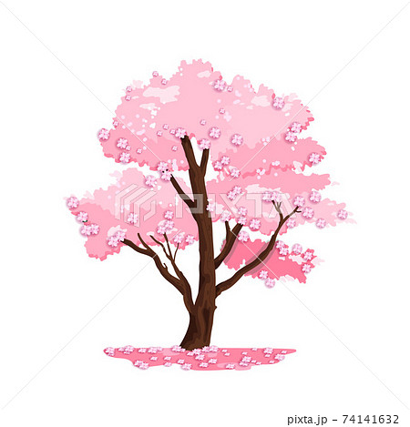 Spring tree vector nature illustration, blossom Japanese sakura, wooden trunk, pink crown.