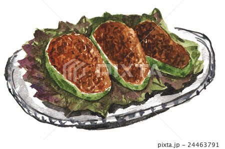 料理イラスト、ピーマンの肉詰めの水彩画
