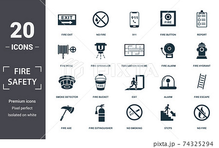 Fire Safety icon set. Contain filled flat 911, fire escape, no fire, fire exit, exit, no smoking icons. Editable format