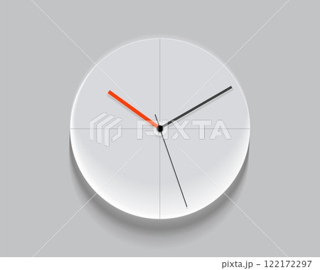 Simple light classic clock in realistic flat style, with a red arrow. Time on white background. Business watch. Vector design element for you project