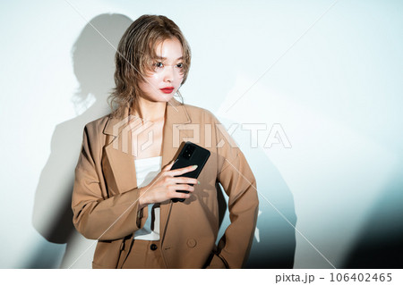 白背景のジャケットを羽織った若い女性のファッションポートレート