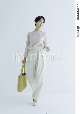 白背景の若い女性の全身のファッションポートレート ハイキー 縦位置