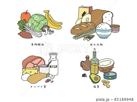 健康的な食生活に欠かせないもののセット 食物繊維、タンパク質、炭水化物、良質な油 ゆるい線画イラスト