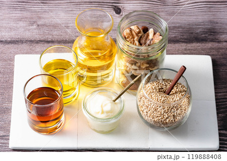いろいろなオイル 調理用 各種の油脂 ウッド背景 俯瞰 アーチ