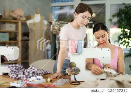 Woman dressmaker trains female assistant on job