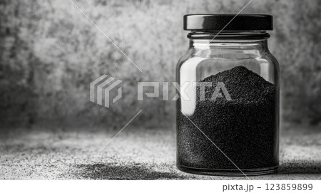Glass Jar Filled with Fine Black Powder on Gray