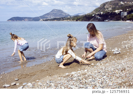 mother with twins daughters on beach lifestyle