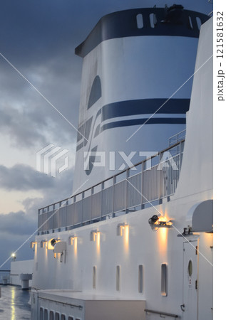 朝の薄明りを受ける太平洋フェリー「いしかり」のファンネル(煙突)