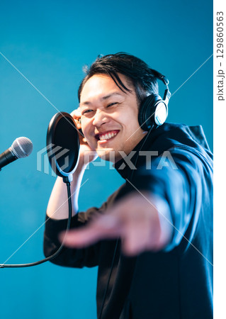 ボイストレーニングをしてレコーディングする若い男性