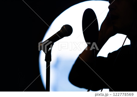 ボイストレーニングをしてレコーディングする若い男性 顔無し