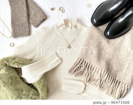 秋冬のファッション ニット、ファーバッグ、マフラー