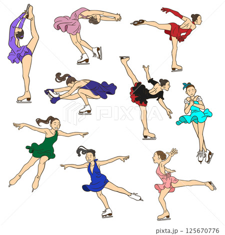 フィギュアスケートで踊る・ジャンプする・回転する女の子(カラー)