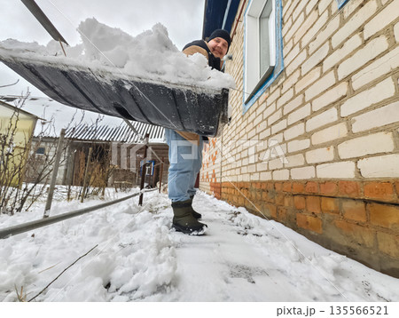 A man smiles as he shovels snow outside a brick house. A man is clearing snow from his yard in winter. Cheerful homeowner working outdoors.