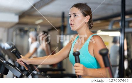 Sporty girl working out on elliptical machine in gym. Healthy active lifestyle concept
