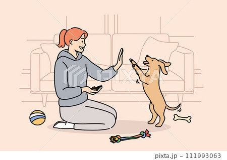 Woman trains dog while sitting on floor near sofa and giving food to puppy after following command