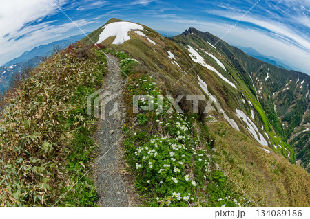 ハクサンイチゲの花と一ノ倉岳・谷川岳(魚眼レンズ撮影)