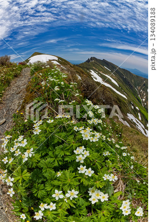 ハクサンイチゲの花と一ノ倉岳・谷川岳・上越国境の山並み(魚眼レンズ撮影)
