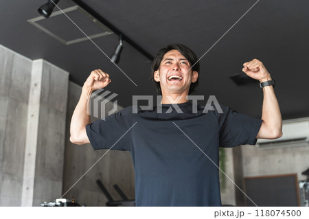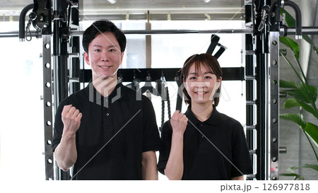 スポーツジムで働くスポーツトレーナー(ガッツポーズ)