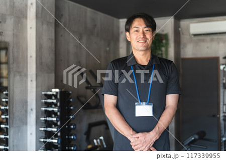 スポーツジムで働くパーソナルトレーナー・インストラクターの若いアジア人男性