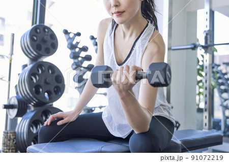 パーソナルジムで上腕二頭筋を鍛える若い女性