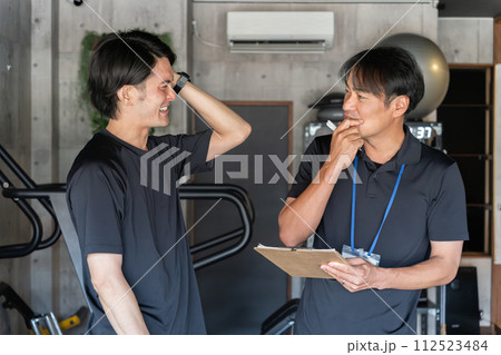 笑顔で会話をするジムのインストラクター(トレーナー)の男性と会員の女性