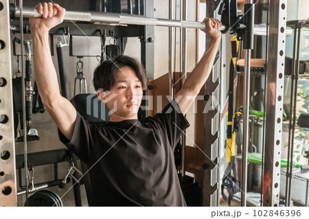 ジムでバーベルを担ぎながらウェイトトレーニングをする若いアジア人男性
