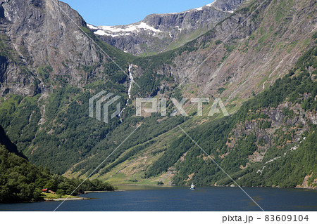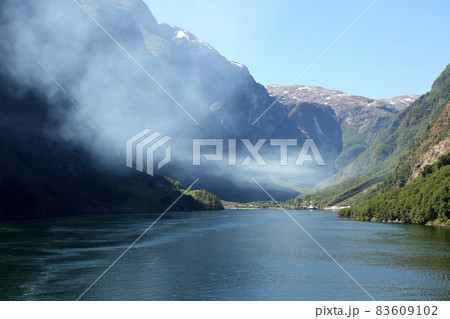 ノルウェー ソグネフィヨルド沿いの村と断崖
