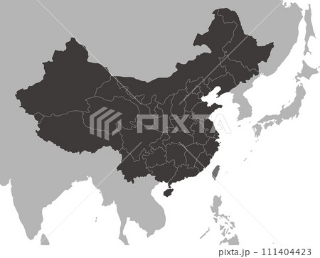 中国と台湾の地図、省の境界線、ユーラシア大陸と日本のシルエット、モノクロ