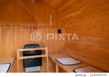キャンプ場の屋外サウナに入る若い女性 キャビンスタイルサウナ フィンランド式屋外サウナ
