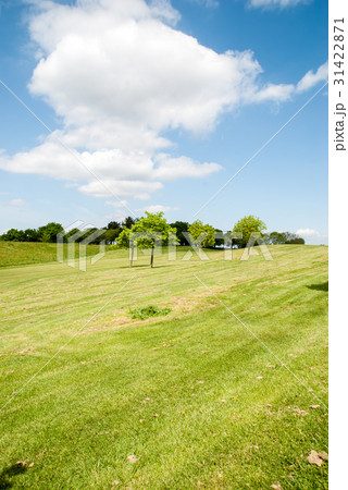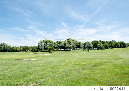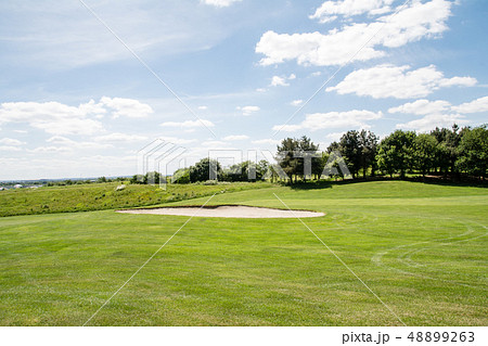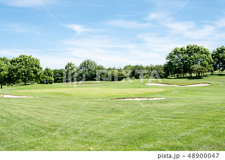 初夏のゴルフ場 フェアーウェーと脇にあるバンカー