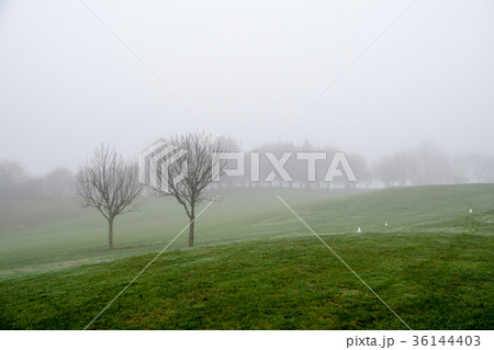 霧のかかったゴルフ場 枝木とかすんだ林とフェアーウェーを散歩する白い鳩