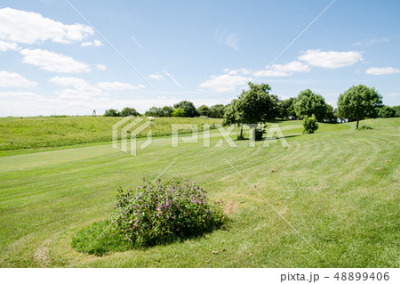 初夏のゴルフ場 青い旗の立つグリーン