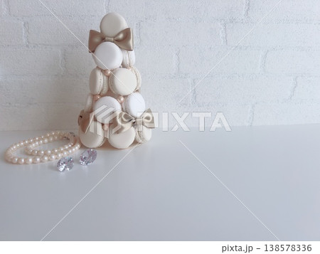 ベージュとホワイトのマカロンタワーとパールのネックレスウェディングイメージ