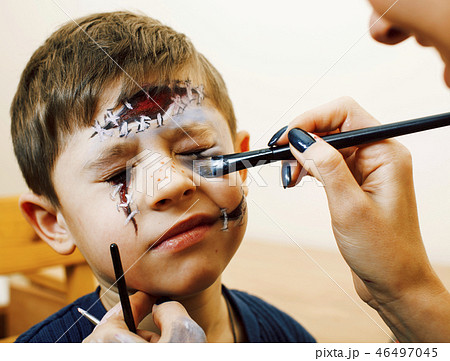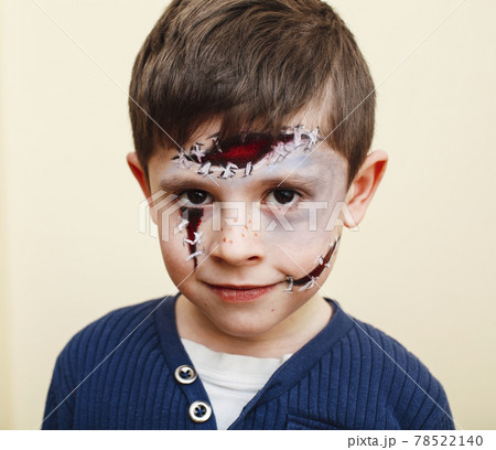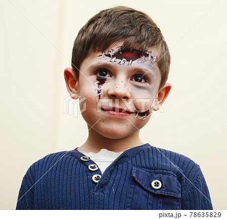 little cute child with facepaint on birthday party, zombie Apocalypse facepainting, halloween preparing concept, lifestyle people