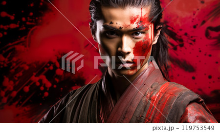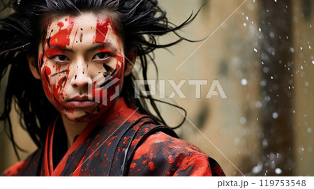 赤いペイントを顔に塗って真剣な表情をする和装の若い男性