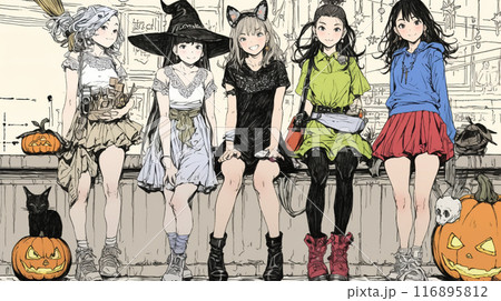 ハロウィンパーティーの準備をするフェイスペイントをした小学生女の子たち ハロウィンメイク