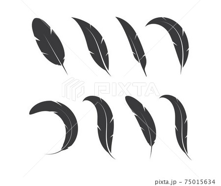 Feather icons. Black plumage silhouettes. Different shapes birdy elements. Smooth and fluffy feathering. Softly and bend lightweight plume. Writing pen. Simple style. Vector quills set