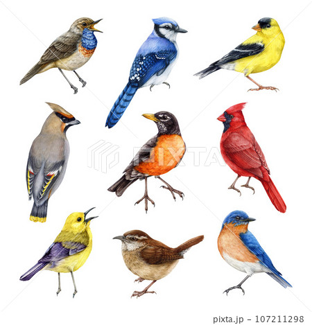 Garden birds watercolor painted illustration set. Hand drawn various garden birds on white background. Bluebird, waxwing, blue jay, robin, warbler, red cardinal elements. Beautifully painted avians