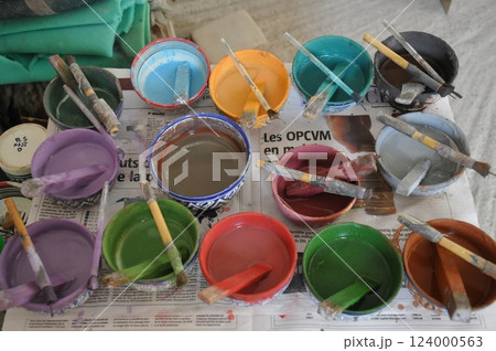 モロッコ、フェズ、メディナ(旧市街)、絵付けの顔料、塗料、フェズ焼き陶器工房