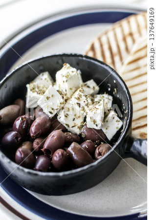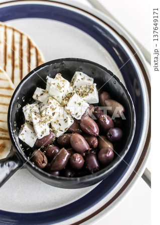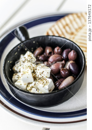 marinated olives and feta cheese tapas snack at outdoor restaurant in mykonos greece