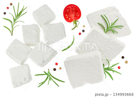 Feta cheese isolated on white background. With full depth of field. Top view. Flat lay