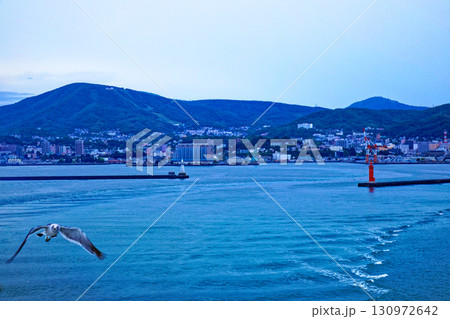小樽港を出港中の新日本海フェリー「あざれあ」より灯台と小樽市の街並みを望む