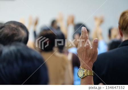 A group of believers raising their hands in prayer during a worship service. The image includes added grain for a classic, emotional atmosphere, suitable for faith, spirituality, and community themes.