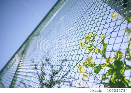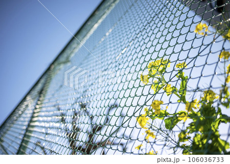 フェンス越しに咲く 菜の花 春の花 イメージ